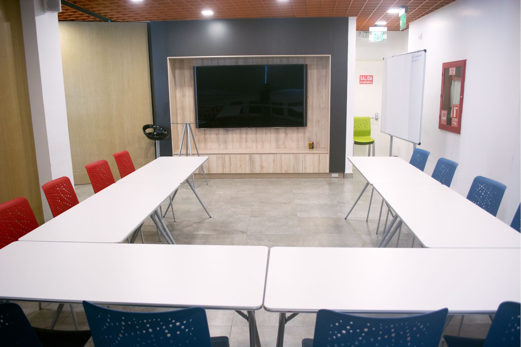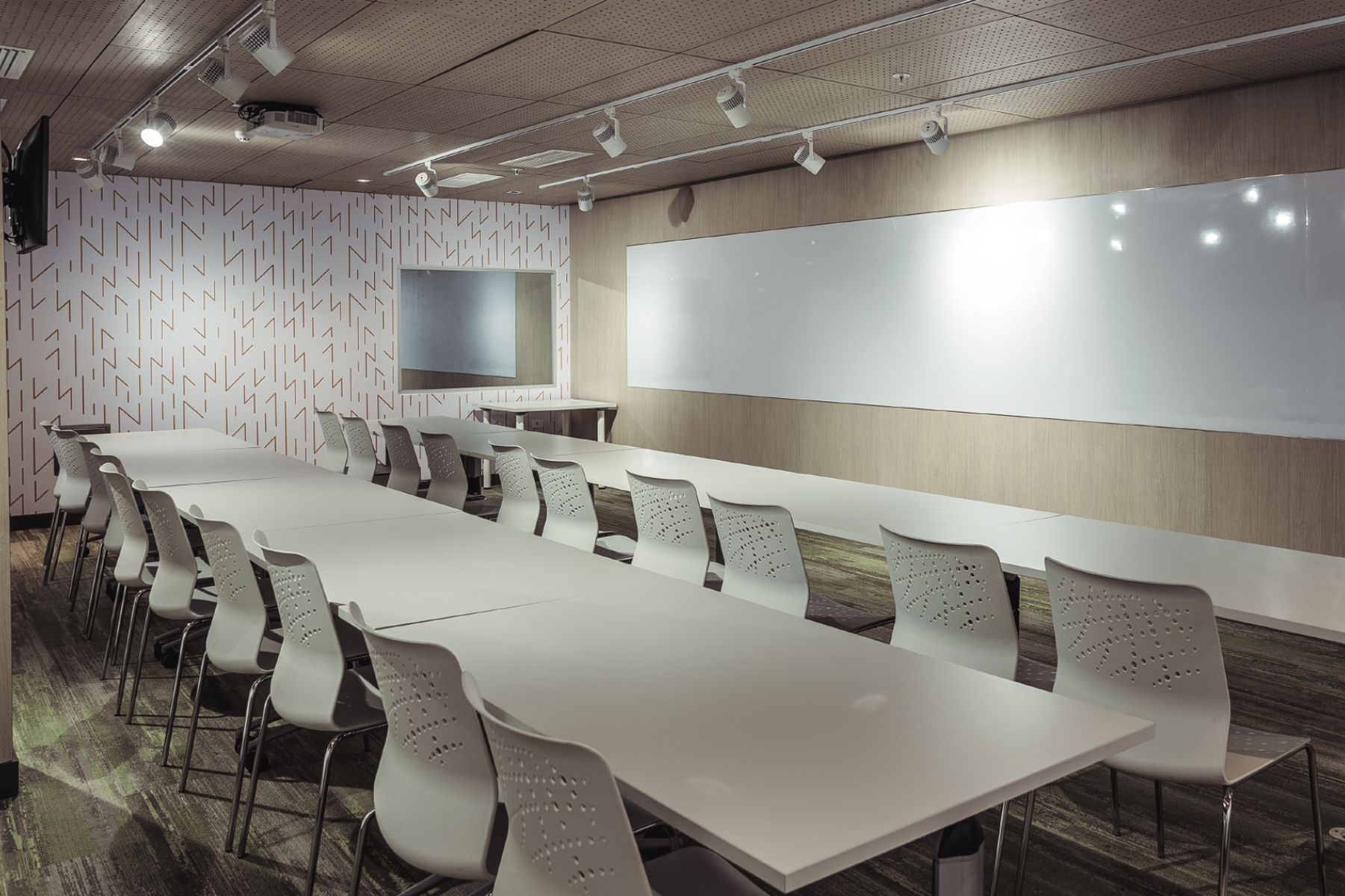 - Espacios equipados con pantallas con cable HDMI, pizarra, marcadores y conexión Wi-Fi de alta velocidad.