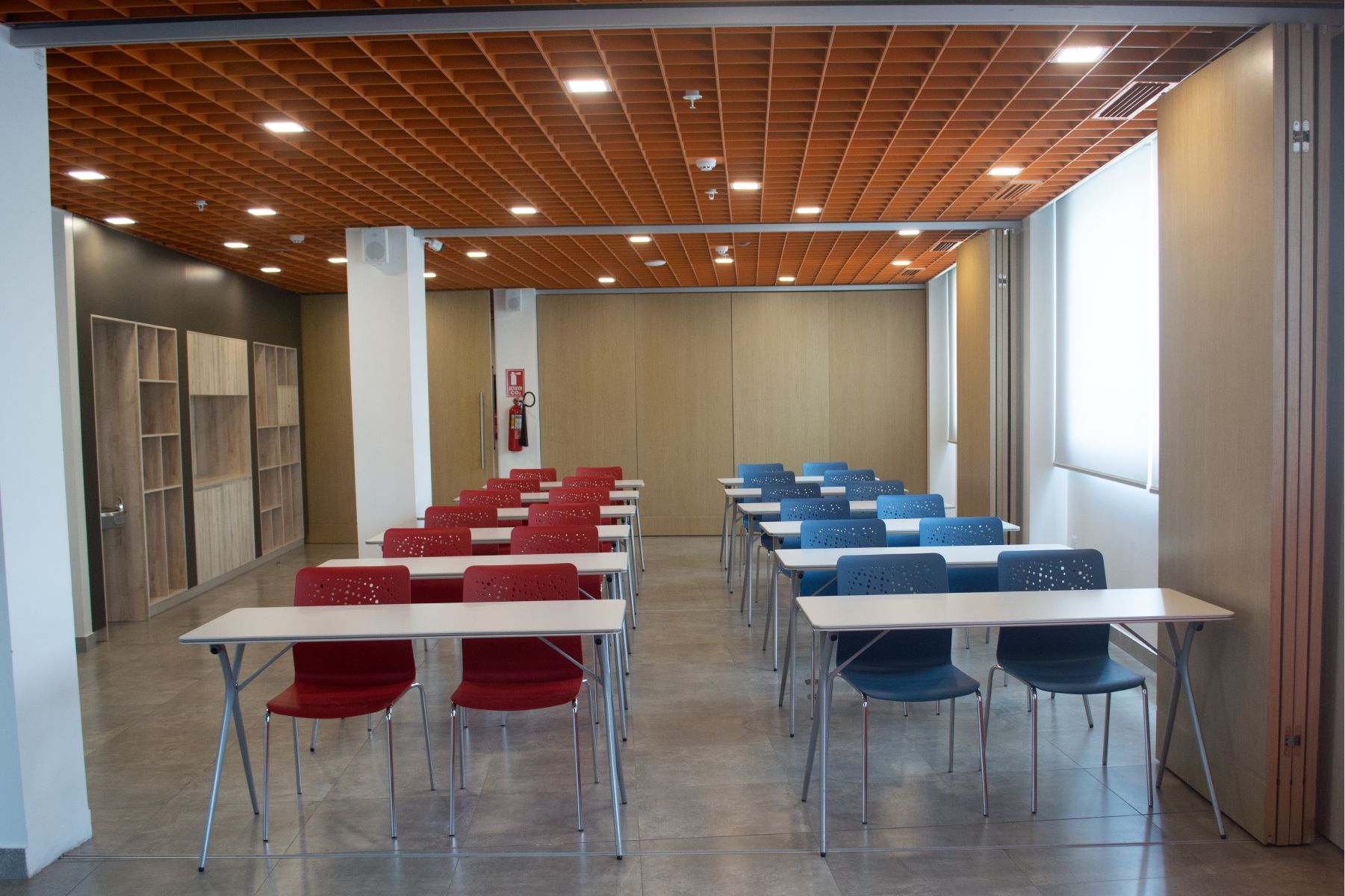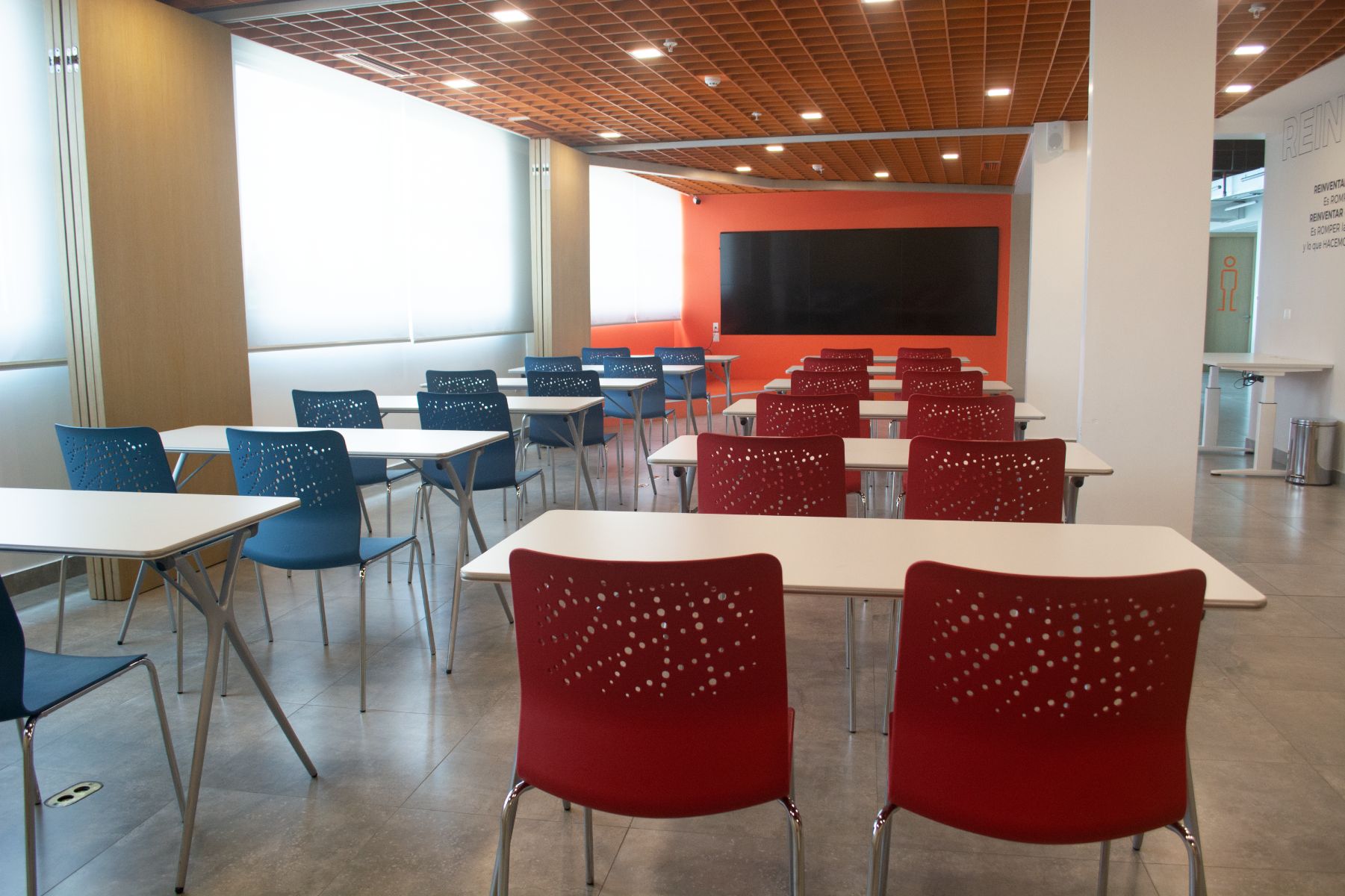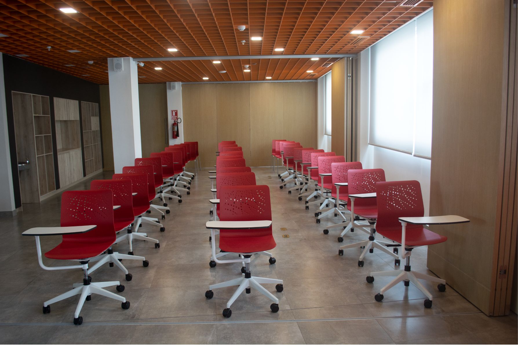 Salón con capacidad para hasta 100 personas dependiendo del mobiliario que requieran, cuenta con un tv wall y audio envolvente, micrófonos inalámbricos y de diadema, ideal para talleres y charlas de mayor audiencia.