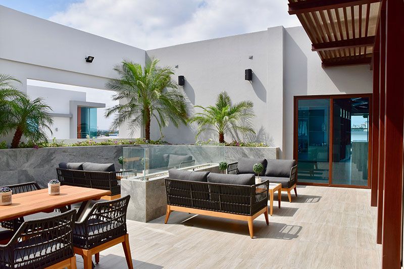 Espacios amplios donde se puede disfrutar momentos amenos al aire libre, cuenta con áreas verdes y mobiliario cómodo.